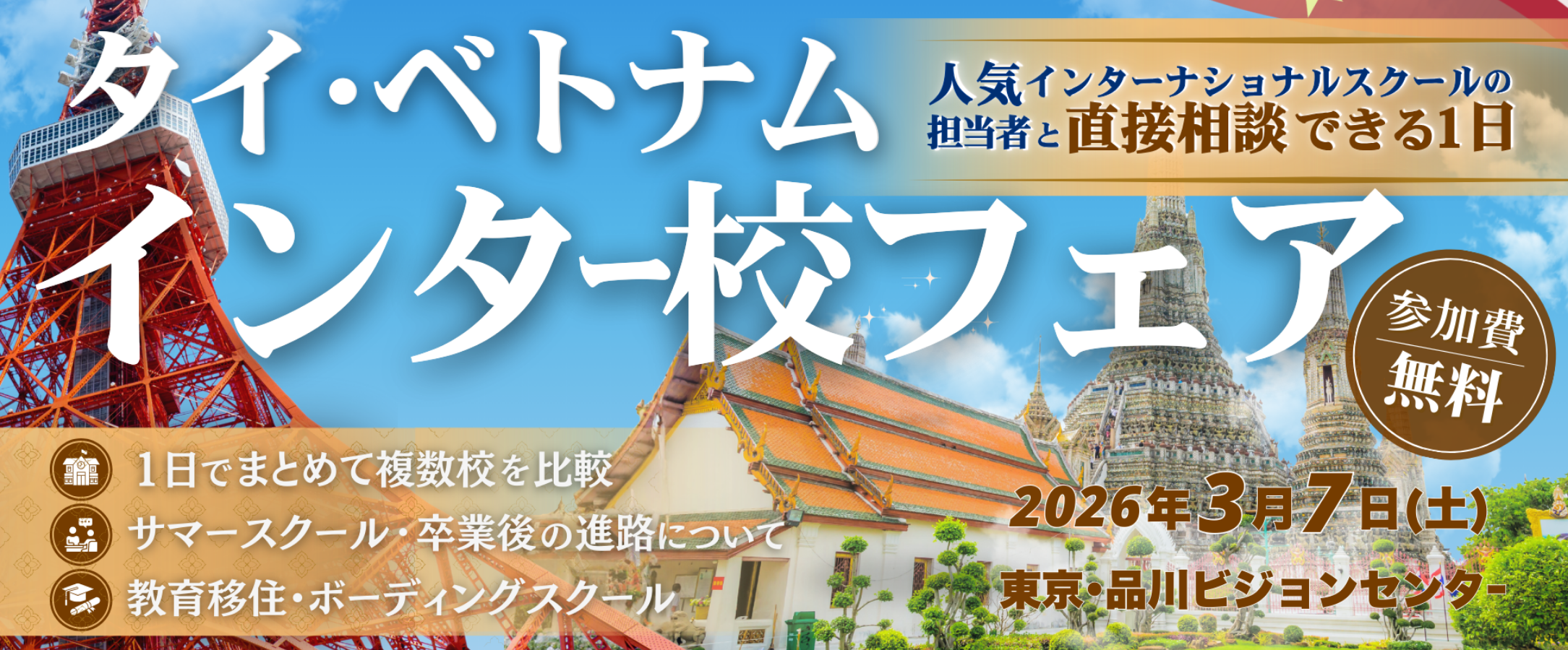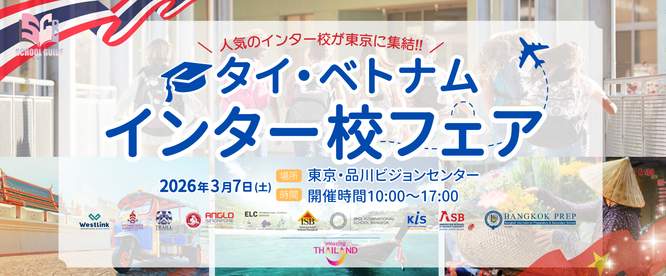 2026年3月7日(土)に東京・品川にて開催予定の「タイ&ベトナム・インターナショナルスクールフェア」に先立ち、事前ウェビナーを開催いたします。学校担当者から学校の特徴や最新情報が聞ける貴重な機会ですのでぜひご参加くださいませ♪