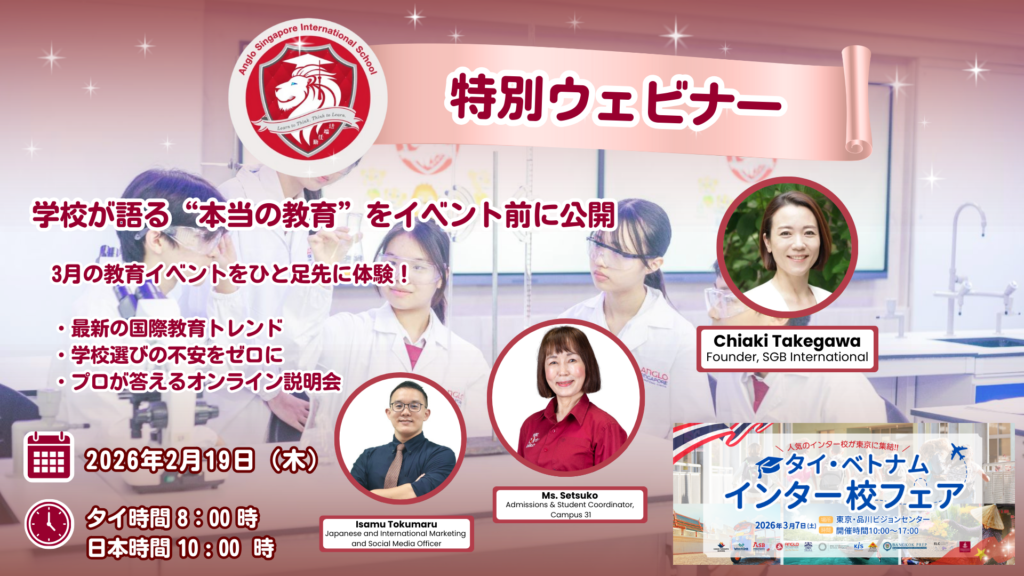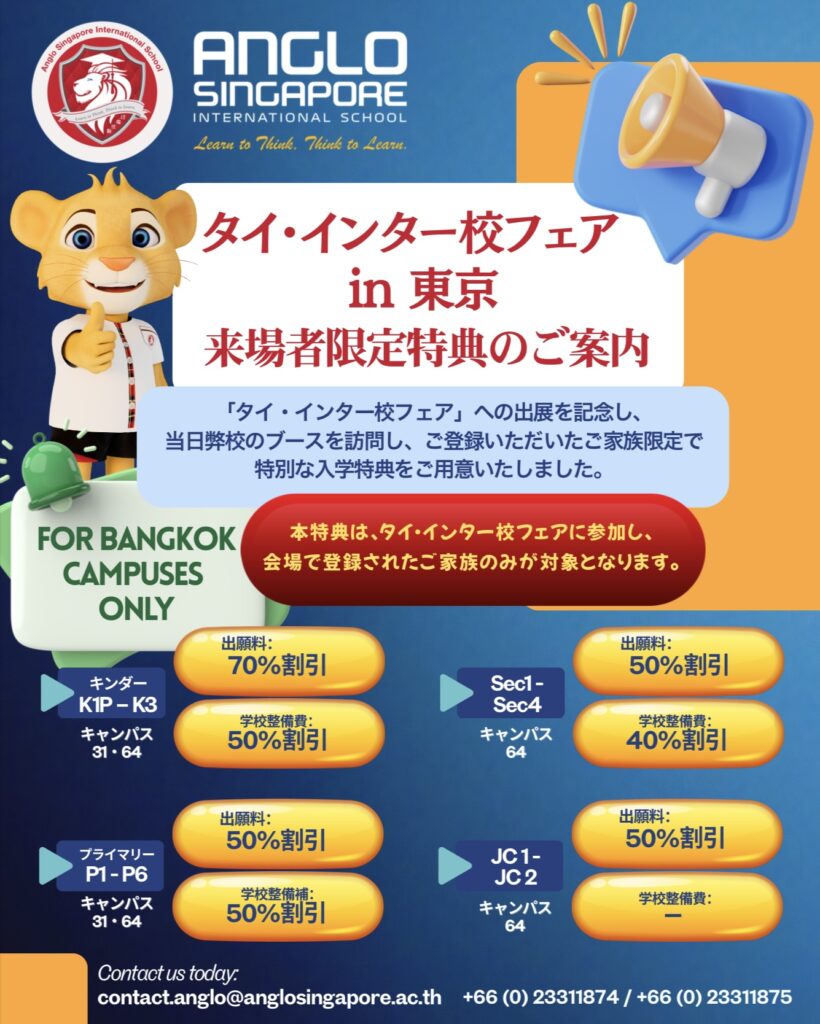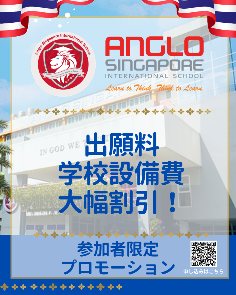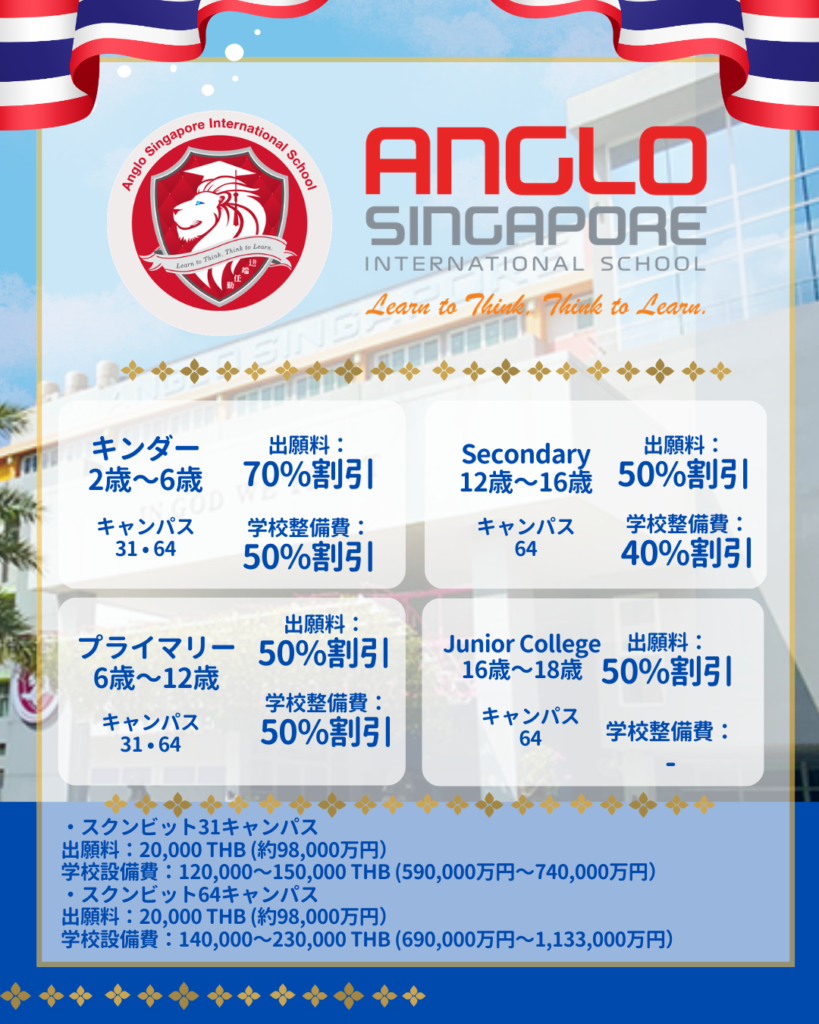 日本人入学課、日本語教員が常駐した アングロ・シンガポール・インターナショナルスクールは、2003年の開校以来、STEM(科学・技術・工学・数学)教育に特化した先進的な学校として高い評価を得ています。シンガポールとイギリス式のカリキュラムを採用し、日本人のお子様が日本と同様の国語教育が受けられるよう日本のカリキュラムに基づいた授業を受けることができます。キャンパス内にはバンコク最大の多目的室プレイグランドもありお子様は遊びを通して学ぶことができます。