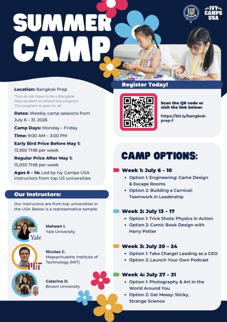 創立22年を迎えるイギリス式インターナショナルスクール、バンコクプレップ。高いアカデミックのみならず、日本語クラスの充実さ、スポーツ施設やアート、ミュージックなど生徒が好きなことに没頭できる環境が整っております。住宅コミュニティー内に学校がある為徒歩で通うこともでき安全な環境で学校生活を送ることができます。近年ではサスティナブル教育にも力を入れており、エコスクールとしても知られた学校です。